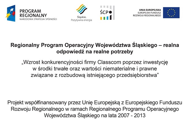 Tytuł projektu: "Wzrost konkurencyjności firmy Classcom poprzez inwestycję w środki trwałe oraz wartości niematerialne i prawne związane z rozbudową istniejącego przedsiębiorstwa"
